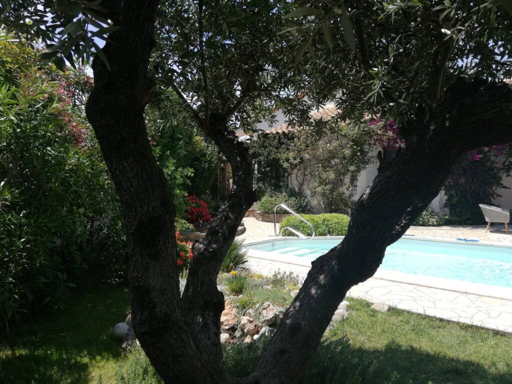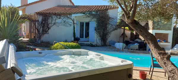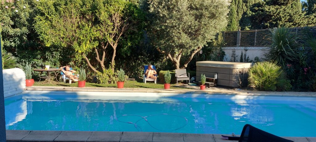 Dans maison d'architecte climatisée avec piscine chauffée (15 avril - 15 octobre selon météo) et spa 50 jets et entièrement Gay et Naturiste Intérieur et Exterieur, au coeur d'un jardin fleuri et arboré.
